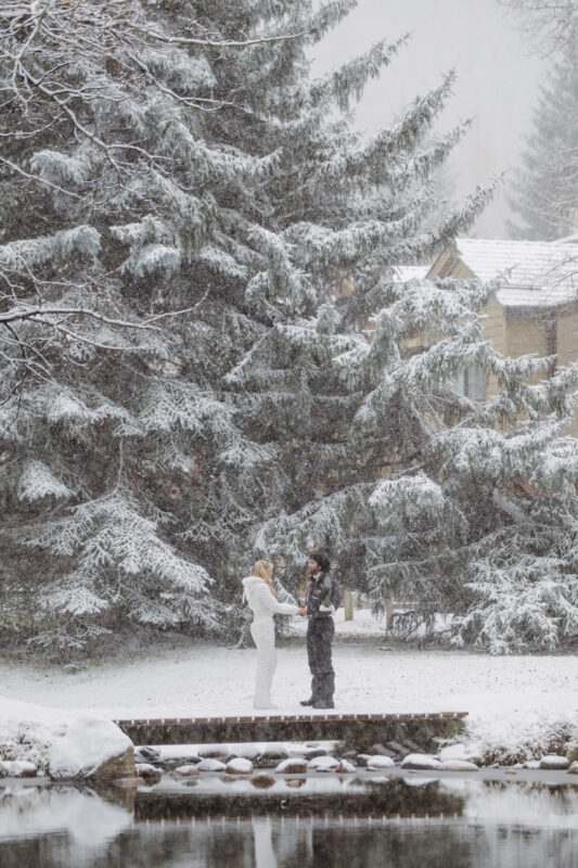 When you’re planning a Snow Globe Proposal in Aspen, timing is everything. Edward had a very specific vision: he wanted a bridge, lots of snow-covered trees, and that magical winter feel. Since the original photographer couldn’t get into town on time, I jumped into action to help him scout the perfect spot. We found a stunning park with a picturesque bridge and deep woods that looked exactly like a scene from a movie.